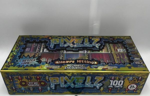 The Pixelz Cart 100 Pack Variety Box is a bulk package containing 100 Pixelz disposable vape carts in assorted flavors and strain profiles. Designed for convenience and variety, this box allows users or retailers to access multiple options in one large, ready-to-use collection.